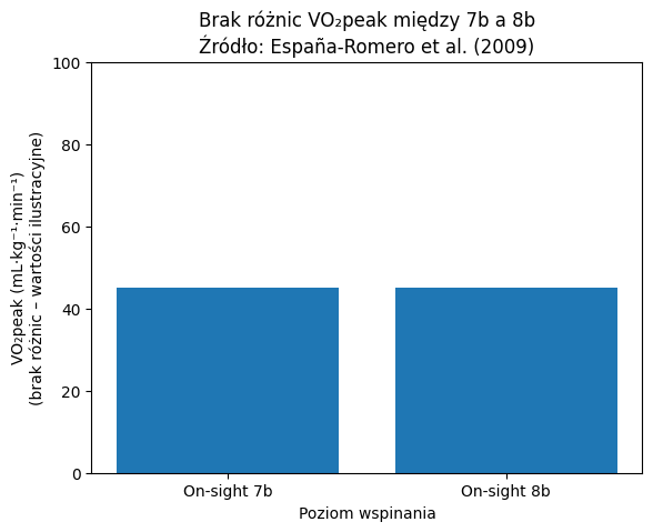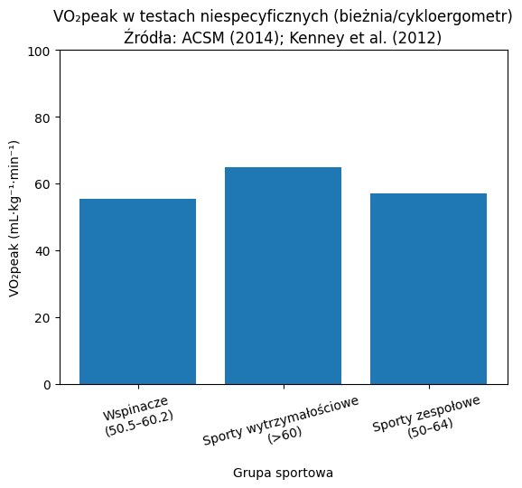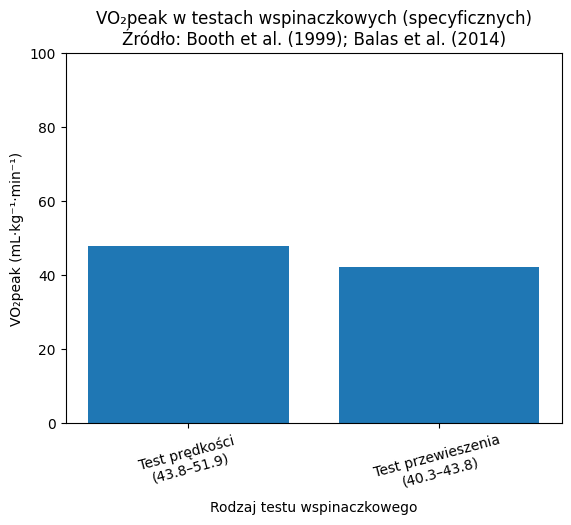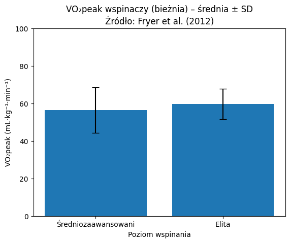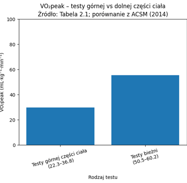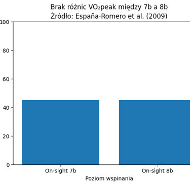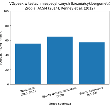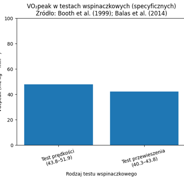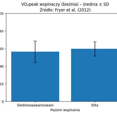 VO₂peak wspinaczy mieści się w przedziale 50,5–60,2 mL·kg⁻¹·min⁻¹ (American College of Sports Medicine, 2014). Mniej niż u sportowców wytrzymałościowych (>60 mL·kg⁻¹·min⁻¹), ale